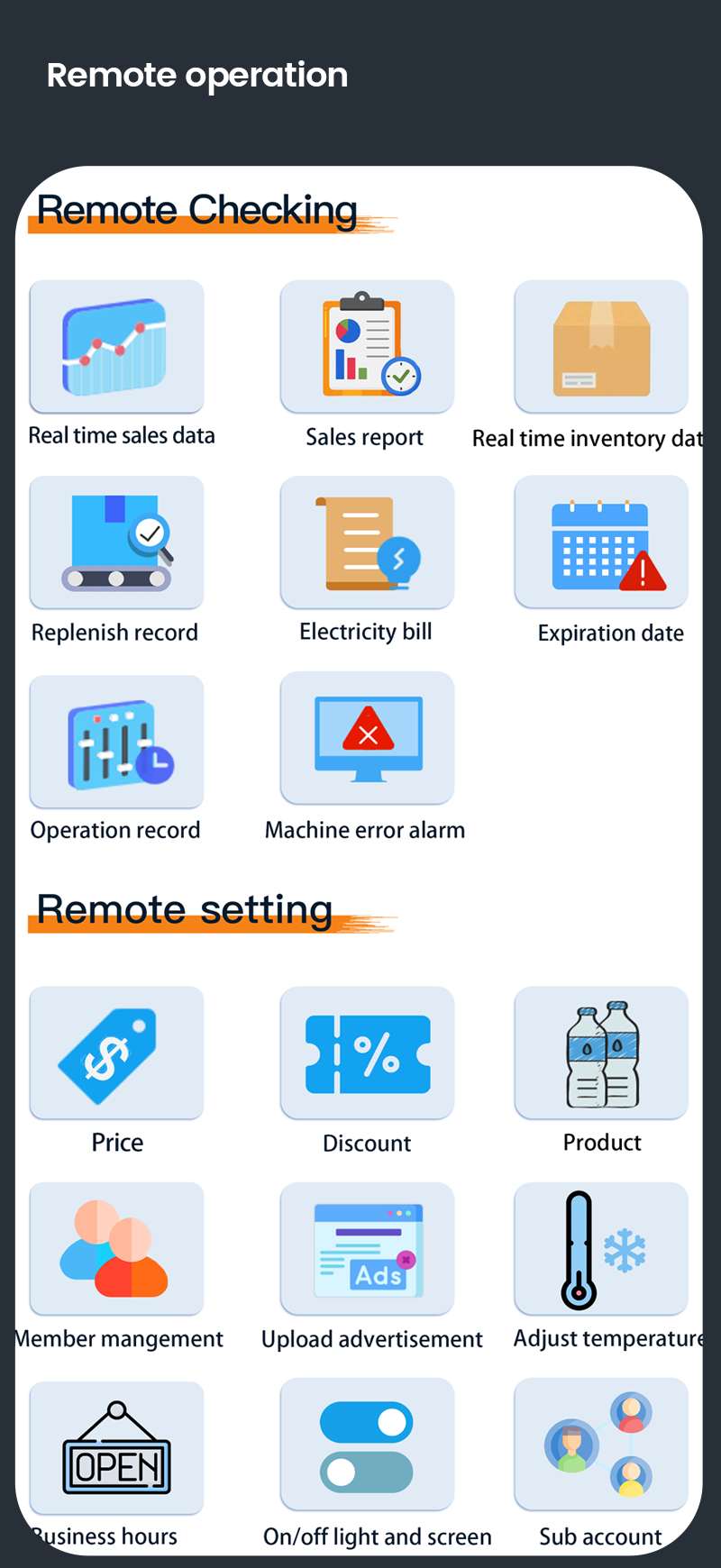 You can check all relevant data on our intelligent management software system, which can be installed on your mobile phone or PC. Moreover, you can remotely control the machine by turning it on/off, adjusting the cooling system, lighting, and switching to online mode.